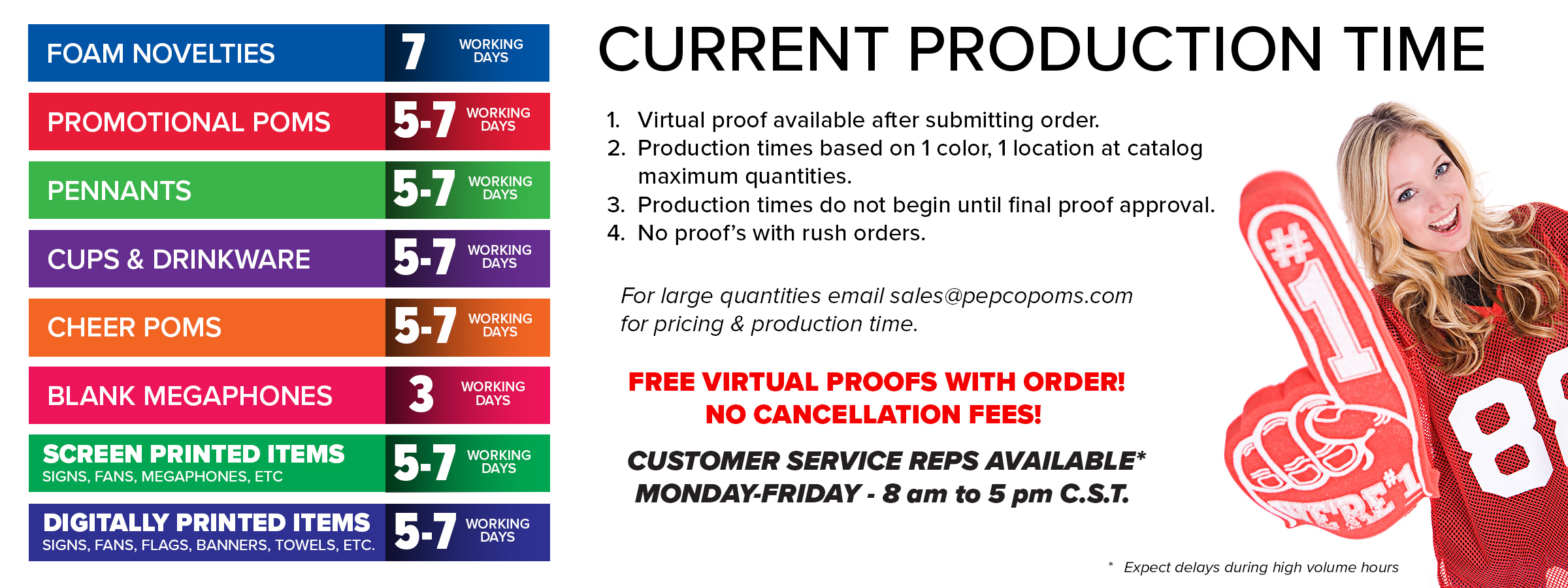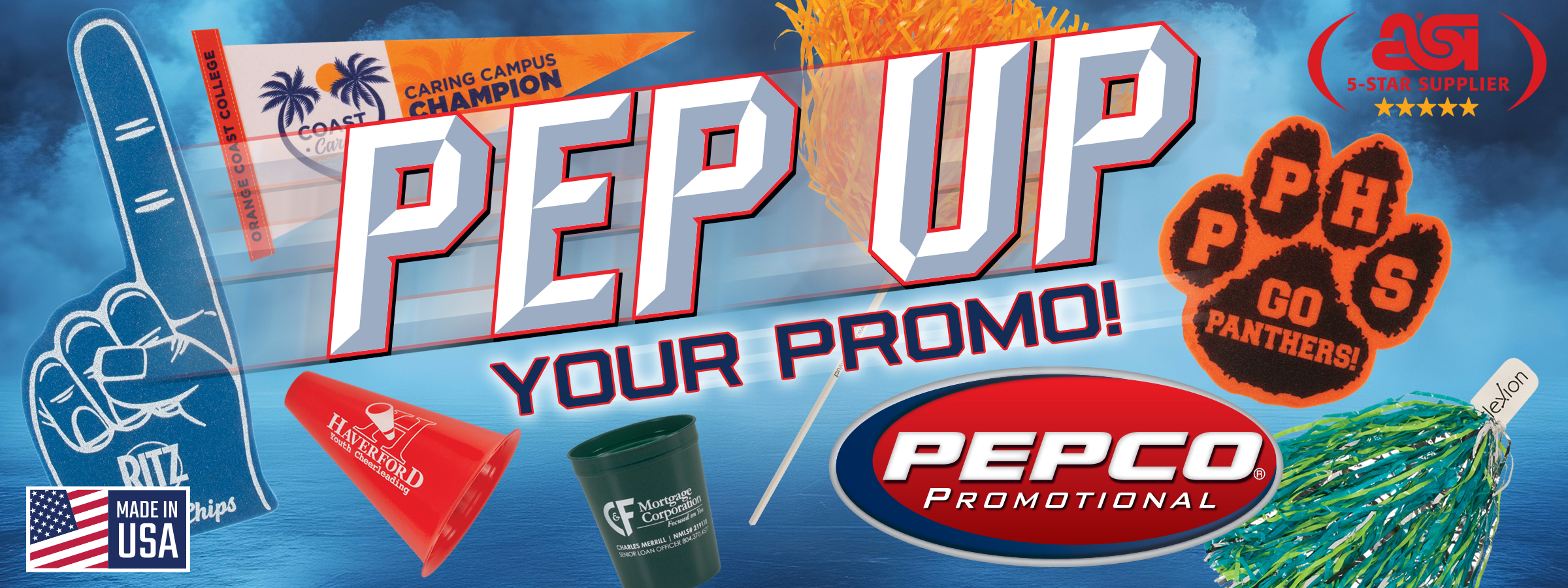 Pepco Promotional – Celebrating over 50 years as America’s leading manufacturer of Sports Promotional Products and School Spirit! We carry a complete line of sports products including – Foam Fingers. Promotional Poms, Megaphones, Pennants, Stadium Cups and Cushions and so much more! And we manufacture all of our products, right here, in the USA. But we are more than just sports. Let us show you how to use sports to promote business today!